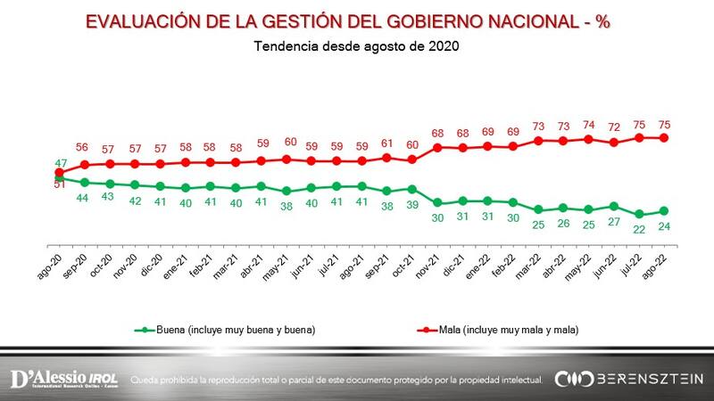 Lo que destaca es la evaluación sobre la gestión del gobierno nacional que continúa con números negativos. El 75% la considera "mala" o "muy mala", similar a la anterior medición. A contramano, el 24% la calificó como "buena" o "muy buena", dos puntos porcentuales por encima del registro pasado.