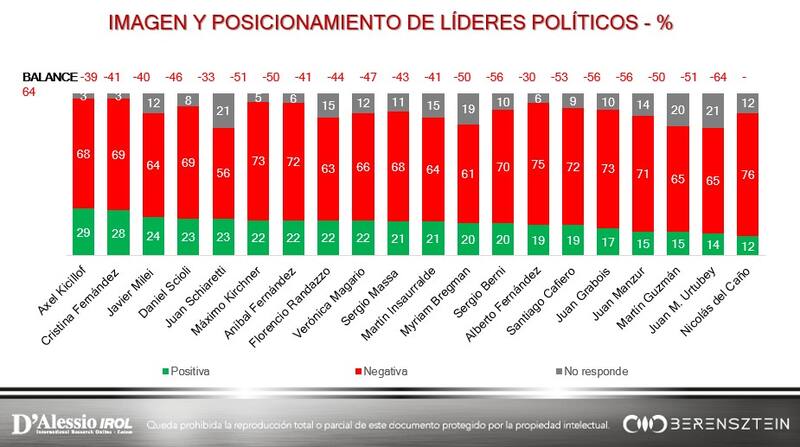 En el pelotón de los peor ubicados sí aparecen más miembros de la coalición oficialista. Además del Presidente, otros con 50 puntos de balance negativo son Juan Manzur (-56), Juan Grabois(-56), Santiago Cafiero (-53), Máximo Kirchner (-51), Aníbal Fernández (-50) y Sergio Berni (-50). El de peor diferencial y mayor imagen negativa, igualmente, es Nicolás del Caño, del FIT, con un 76% de rechazo.