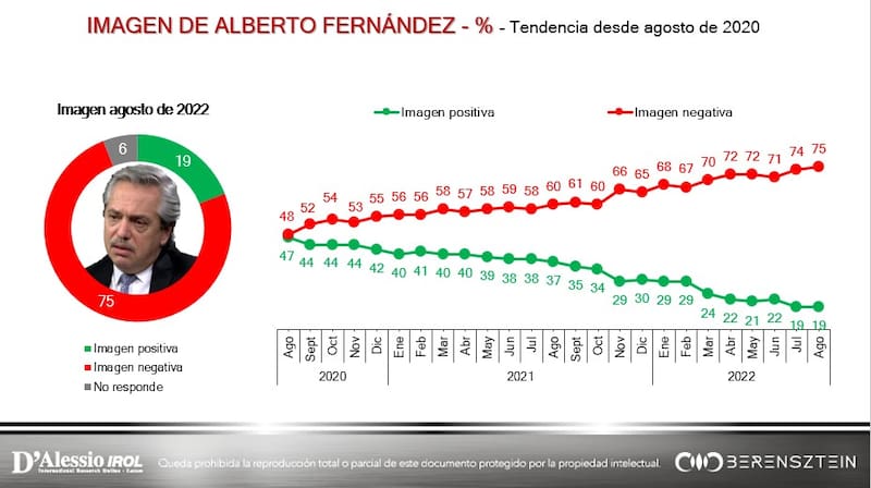 El estudio midió también la imagen de varios de los principales líderes políticos de la Argentina. Se consolidan los malos números para Alberto Fernández. El Presidente tiene un 75% de imagen negativa, el número más alto de la serie histórica. La brecha se agranda de forma constante desde agosto de 2020, cuando estaba equilibrado. Solo tiene un 19% de imagen positiva, con un diferencial de -56.