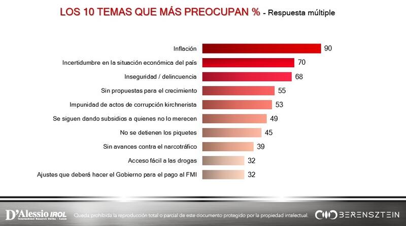 También se analizaron los temas que generan mayor preocupación entre los argentinos. El 90% de los consultados señaló a la inflación y completan el podio la incertidumbre por la situación económica (70%) y la inseguridad (68%). Estos tres temas se mantienen entre los más mencionados durante los últimos meses.
