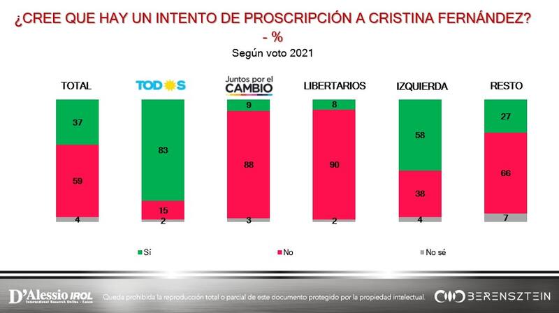 Pero las diferencias son aún más evidentes cuando se consulta si existe un intento de proscripción a Cristina Kirchner. El 37% del total contestó que sí: pero son 83% entre los simpatizantes del oficialismo y solo 9% entre los que votaron a la principal fuerza opositora el año pasado.
