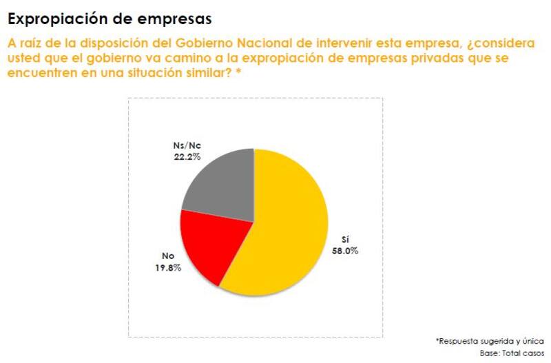 Al preguntar si la expropiación de otras empresas tras el caso Vicentin puede ser posible, el 58% dijo creer que el Gobierno puede avanzar en esa línea con compañias en situación similar a la cerealera, contra 19,8% que cree que no y un 22,2% que no sabe o no contesta.