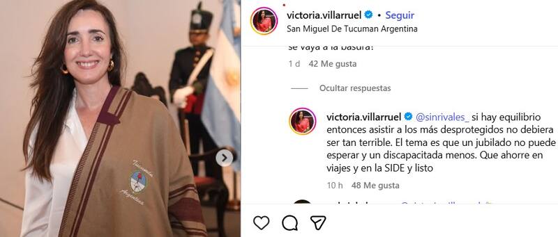 "Del Presidente nos acordaremos. De las/os vices nadie se acuerda", le espetó otro usuario. "¡Mejor! Así vivo mi vida en paz, dado que así vivimos los que no robamos", arremetió Villarruel, quien, con ironía, dijo que el mandatario tendría que haber elegido como compañera de fórmula "a la hermana o a la Limones (por Lilia Lemoine), que a ustedes les gustan tanto".