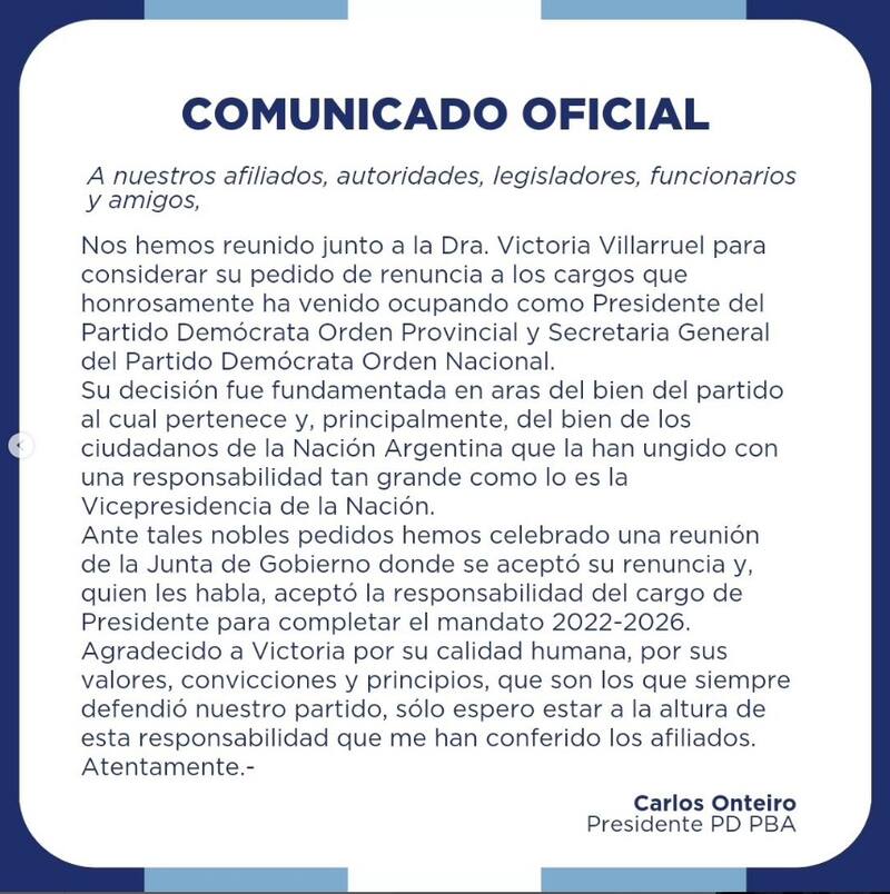 En un comunicado, Carlos Onteiro, quién asumió la presidencia del PD tras la renuncia, oficializó la decisión. "Nos hemos reunido junto a la Dra. Victoria Villarruel para considerar su pedido de renuncia a los cargos que honrosamente ha venido ocupando como Presidenta del Partido Demócrata Orden Provincial y Secretaria General del Partido Demócrata Orden Nacional", mencionaron.