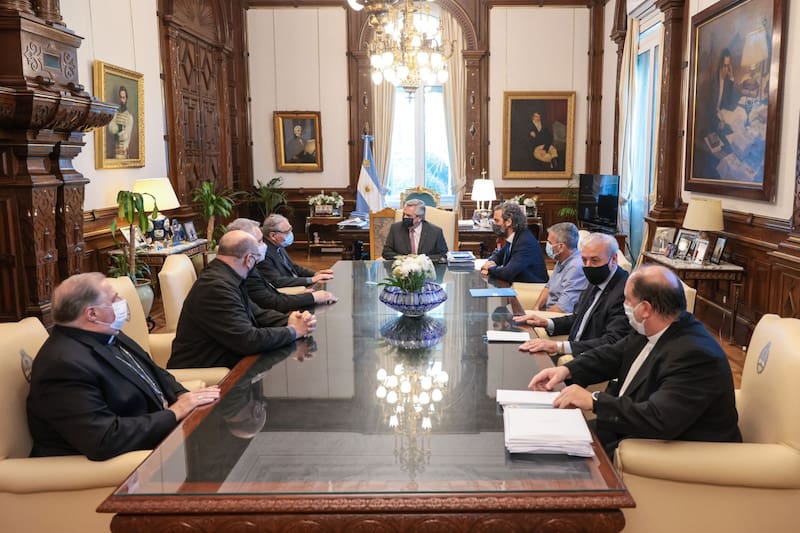 La Conferencia Episcopal Argentina (CEA), representada por su Comisión Ejecutiva, al mando del obispo de San Isidro, Oscar Ojea, visistó al Presidente en su despacho y discutió, además, su parecer sobre la cuestión social, en compañía del canciller Santiago Cafiero; el secretario de Culto, Guillermo Oliveri, y la particular presencia del titular de Desarrollo Social, Juan Zabaleta.
