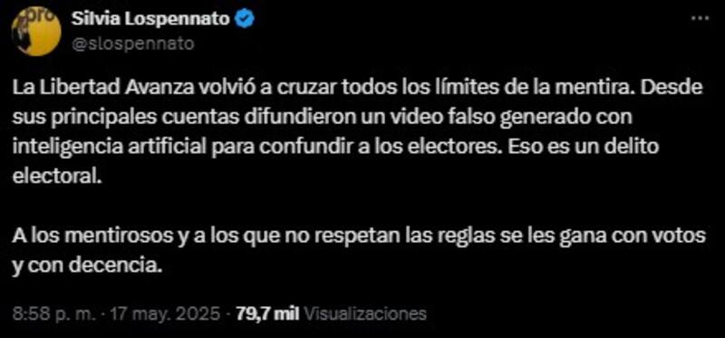 "La Libertad Avanza volvió a cruzar todos los límites de la mentira. Desde sus principales cuentas difundieron un video falso generado con inteligencia artificial para confundir a los electores. Eso es un delito electoral.A los mentirosos y a los que no respetan las reglas se les gana con votos y con decencia", escribió Lospennato en su cuenta de red social X.
