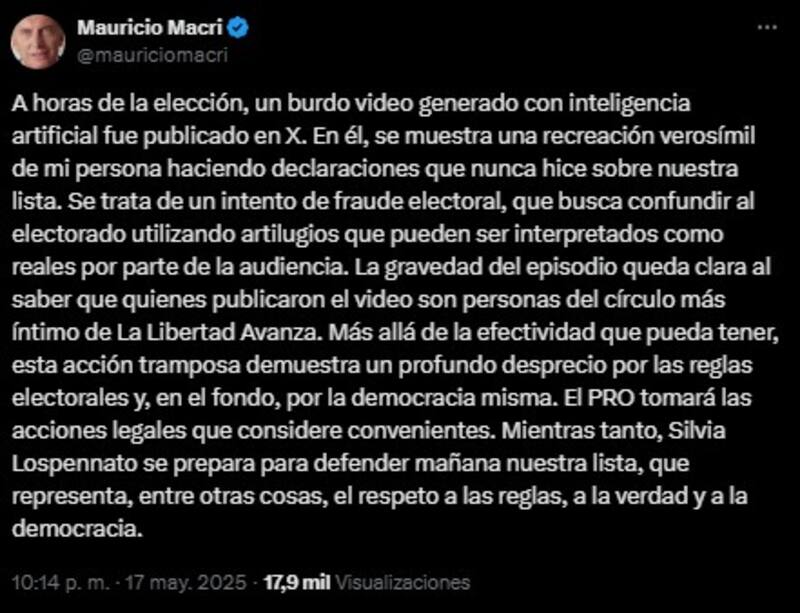 Según Macri, se trata "de un intento de fraude electoral, que busca confundir al electorado utilizando artilugios que pueden ser interpretados como reales por parte de la audiencia". En ese sentido, consideró que "la gravedad del episodio queda clara al saber que quienes publicaron el video son personas del círculo más íntimo de La Libertad Avanza".