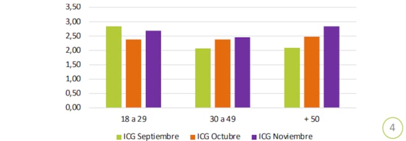 El ICG de noviembre se ubicó en 2,66 puntos sobre una escala de 0 a 5, un aumento del 9,86% respecto del mes anterior. Este repunte permitió superar el promedio de confianza registrado durante los primeros 12 meses de gestión, que fue de 2,52 puntos.