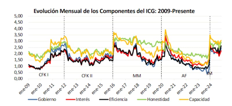 El índice reflejó un aumento en los cinco componentes que lo conforman, con avances especialmente importantes en la "Evaluación general del gobierno", que subió un 20% (2,46 puntos), y en la "Eficiencia en la administración del gasto público", con un incremento del 12,1% (2,64 puntos). Otros rubros, como "Honestidad de los funcionarios" y "Preocupación por el interés general", también crecieron, alcanzando 2,93 y 2,24 puntos, respectivamente. Por último, la "Capacidad para resolver los problemas del país" se mantuvo como el ítem más alto, con 3,07 puntos y una suba del 3,2%.