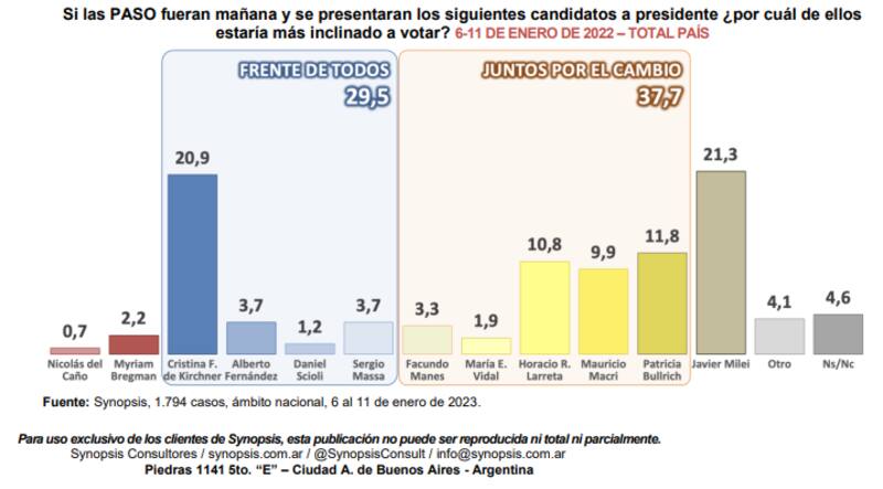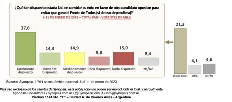 Una observación que hacen desde Synopsis es "el riesgo" de que los votantes de Milei terminen migrando a apoyar la principal oferta opositora, si la pelea entre el Frente de Todos y Juntos por el Cambio se empareja.