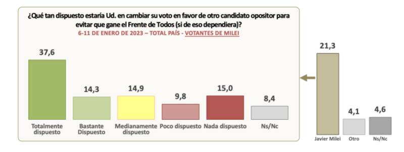 De acuerdo al estudio, más del 37% de sus votantes están "totalmente dispuesto" a cambiar su voto en favor de otro candidato opositor, para evitar un triunfo del Frente de Todos. EL 14,3%, "bastante dispuesto" y un porcentaje similar, "medianamente dispuesto".