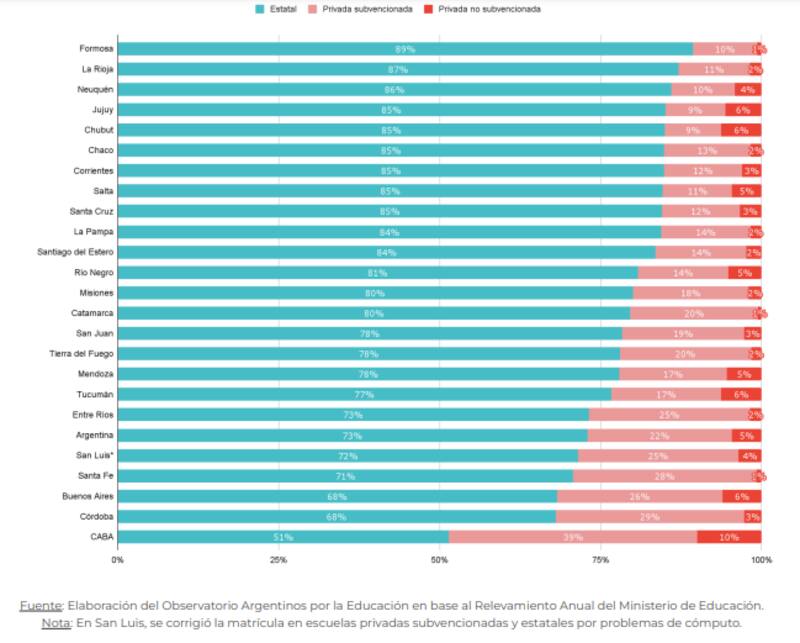 De acuerdo a los datos de matrícula 2021 recopilados por el Relevamiento Anual del exMinisterio de Educación sobre la distribución de los alumnos según el tipo de gestión y la institución a la que asisten en cada provincia, el 22% a nivel país mostró el estadio " Gestión privada con subvención estatal".