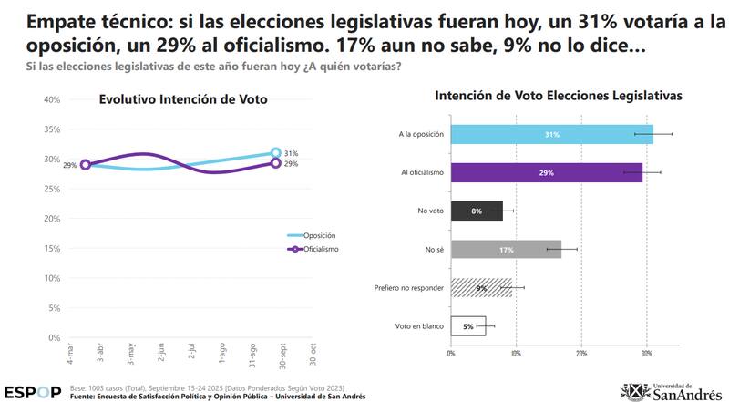 En ese marco, la pregunta central del sondeo es si las elecciones legislativas fueran hoy, ¿qué ocurriría? Según la encuesta, un 31% votaría a la oposición y un 29% al oficialismo. Un 17% todavía no sabe a quién apoyar y un 9% prefiere no decirlo. "El resultado está abierto", concluyeron los investigadores.