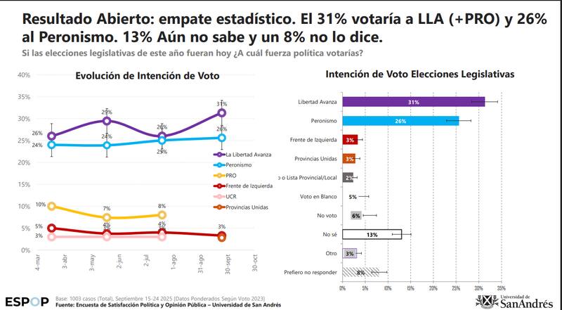 Cuando la consulta se enfocó en alianzas políticas específicas, los resultados marcaron otro empate. La Libertad Avanza y el PRO alcanzaron el 31% de las preferencias, mientras que el peronismo reunió el 26%. El margen de error, cercano a los tres puntos, convierte a esa diferencia en estadísticamente irrelevante. El 13% de los consultados sigue indeciso y un 8% no blanquea su opción.