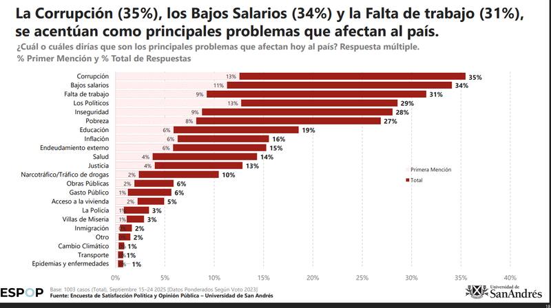 El malhumor social se reflejó en los problemas que más preocupan a los argentinos. La corrupción, con un 35%, encabeza el ranking. Detrás se ubican los bajos salarios (34%) y la falta de trabajo (31%). La inseguridad, históricamente dominante, bajó al 28%.