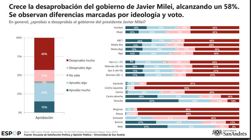 La aprobación presidencial también evidenció desgaste. En septiembre se ubicó en 39%, tres puntos menos que en julio. En paralelo, la desaprobación trepó al 58%. Entre los votantes de Milei, la aprobación llegó al 79%, pero entre los de Massa cayó al 4%.