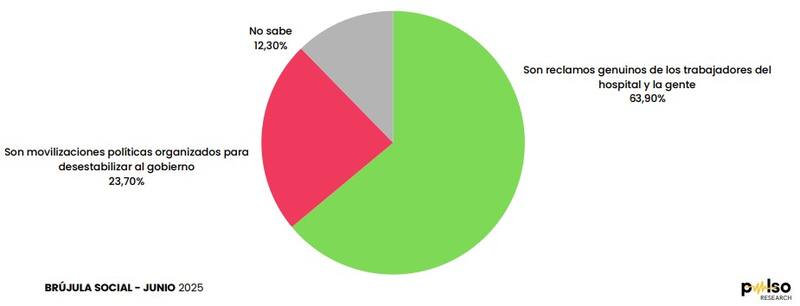 El conflicto tiene un fuerte respaldo social. Según una encuesta de Pulso Research difundida esta semana, el 63,9% de los argentinos considera que los reclamos son "genuinos", mientras que solo el 23,7% los atribuye a una estrategia política contra el Gobierno. Estos números contrastan con la postura oficial, que insiste en vincular las protestas con una campaña de desestabilización.