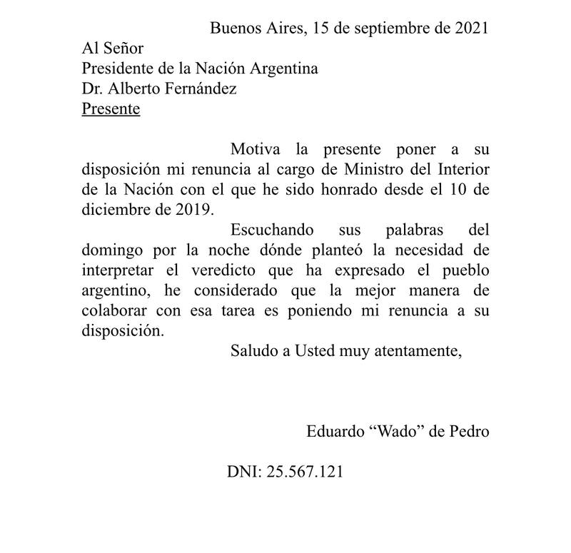 "Motiva la presente poner a su disposición mi renuncia al cargo de Ministro del Interior de la Nación con el que he sido honrado desde el 10 de diciembre de 2019". Sin introducción, con ese párrafo, en una carta dirigida al presidente Alberto Fernández,Eduardo "Wado" De Pedro se acaba de ofrecer su salida del gabinete, después de la derrota electoral del oficialismo en las PASO 2021.