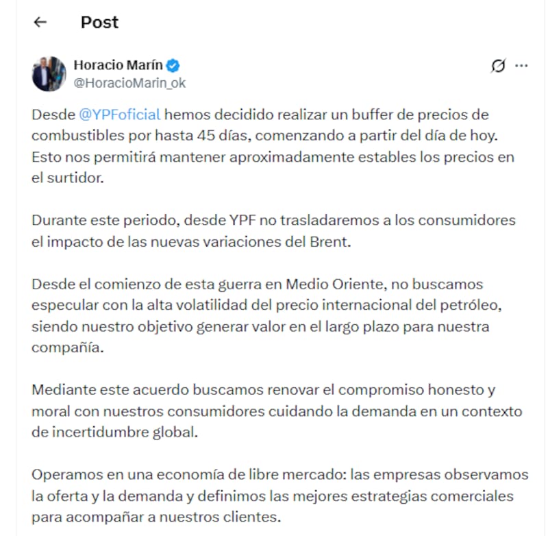El presidente de YPF, Horacio Marín, anunció que la compañía aplicará un esquema de “buffer” para los precios de los combustibles que permitirá mantenerlos “aproximadamente estables” durante los próximos 45 días, en medio de la volatilidad internacional del petróleo por el conflicto en Medio Oriente.