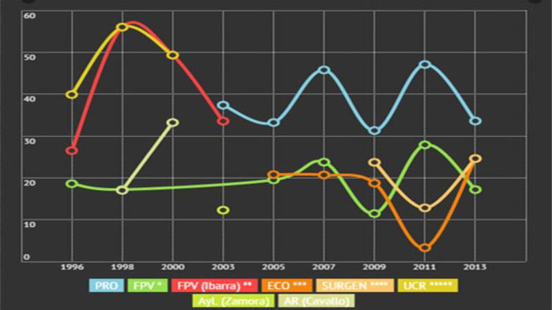 Los antecedentes del Frente para la Victoria son también directos (a veces solo y otros en alianzas) desde 2005 para acá y menos claros hasta entonces (hay dos elecciones, por ejemplo, en los que Ibarra ganó pero enfrentado al peronismo). El PJ terminó con el 18,6% en 1996 (a jefe de Gobierno) y el 17,2% en 1998 (Legisladores). El FPV como tal, mientras, sacó el 19,51% en 2005; el 23,75% en 2007; el 11,47% en 2009; el 27,87% en 2011 y el 17,18% en 2013.