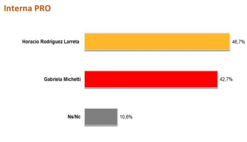 Un sondeo realizado la semana pasada por M&F, la consultora que conduce Mariel Fornoni, le da al jefe de Gabinete porteño una intención de voto del 21%, frente al 19,5% de la diputada nacional. La diferencia es de apenas 1,5 puntos, menos de la mitad del margen de error de la muestra (+/- 3,46%), lo que implica casi un empate técnico, aunque el sondeo específico sobre la interna del PRO lo da ganador a Rodríguez Larreta.