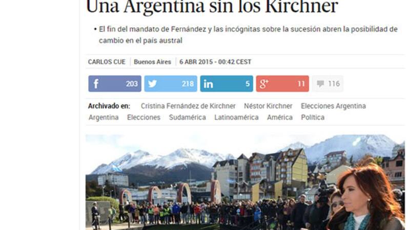 “Durante 12 años, casi todo en Argentina ha pasado por una letra: la K de Kirchner. Políticos K, empresarios, jueces y fiscales K, periodistas pro y anti K. Esa época toca a su fin porque Cristina Fernández de Kirchner no tuvo fuerza política suficiente para reformar la Constitución, como quería, y no puede volver a presentarse en las elecciones de octubre”, arranca el análisis firmado por Carlos Cue y titulado, justamente, “Una Argentina sin los Kirchner”.
