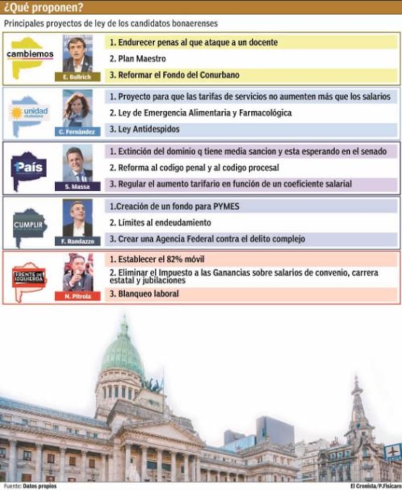 La polarización divide ambas orillas de la grieta: en la recta final de la campaña es más fácil escuchar las críticas cruzadas entre los candidatos que sus propuestas en caso de resultar electos. Por eso, El Cronista les pidió la semana pasada a los equipos de campaña de los postulantes a senadores por la provincia de Buenos Aires los tres proyectos de ley que presentarían desde una banca en el Congreso. Tomándose más o menos tiempo, los cinco frentes que se enfrentarán el domingo respondieron.