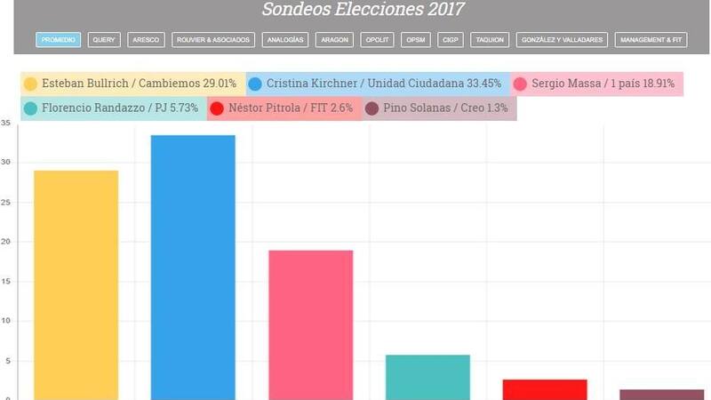 Un promedio simple de las últimas proyecciones conocidas de doce encuestadoras (a partir de sondeos realizados a lo largo de julio), plantea un escenario polarizado pero bastante definido en el que Cristina lograría el 33,86% de los votos, contra el 28,64% de Bullrich y el 18,93% de Massa, con el exministro de Interior y Transporte Florencio Randazzo cuarto pero muy por debajo del 10%.