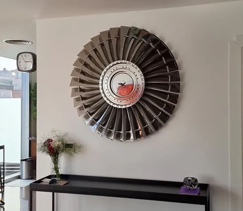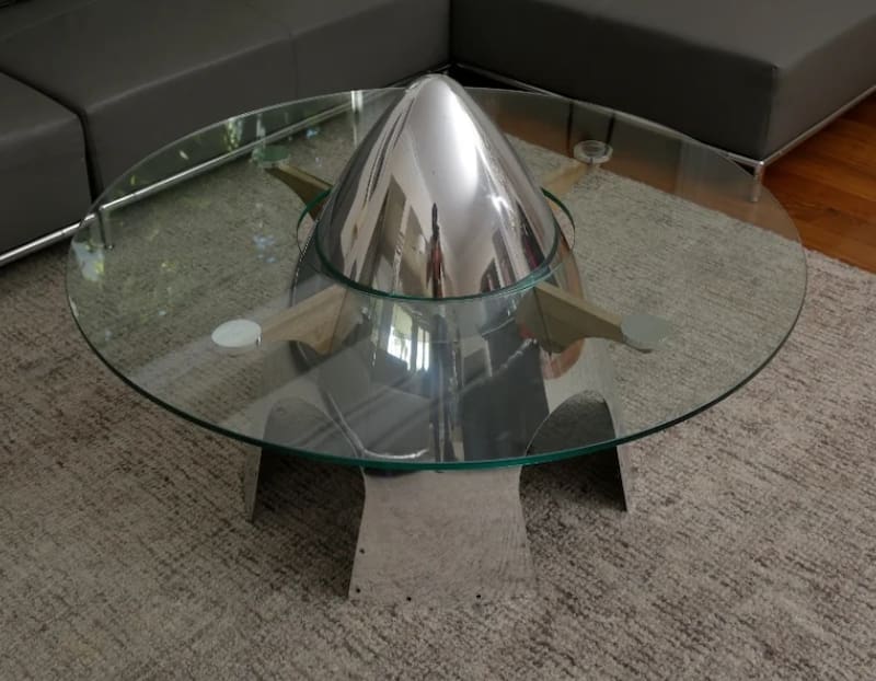 Escritorios hechos con secciones de alas, esculturas con las aspas de los motores de los aviones, mesas de café con las llantas de los aviones pulidas y cromadas, mesas ejecutivas construidas con tanques de combustible que parecen misiles o bombas; son algunos de los productos que venden.