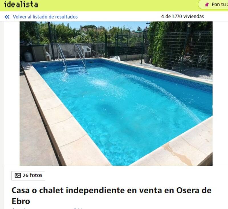 Por el mismo precio, se encuentra esta casa construida en 1980 y a 30 minutos de Zaragoza. Tiene 61 m2 de vivienda distribuida en dos habitaciones, salón, cocina, baño y porche. Cocina y baño en buen estado. Su piscina es de 39 m2, arbolado, zona asfaltada y zona de parking para el coche.