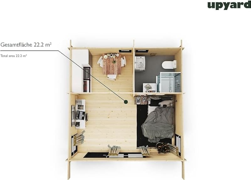 El interior incluye un dormitorio, una cocina y un baño, con una distribución funcional y un diseño estético que favorece la luminosidad y la eficiencia energética. La instalación es sencilla, gracias a un suelo compuesto por vigas y tablas, mientras que el techo se monta de manera ágil utilizando tablas de instalación rápida.