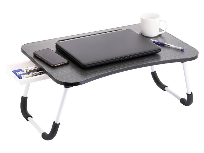 Fabricada en tablero de fibra de densidad media (MDF), este mueble portátil cuenta con soporte para tableta o móvil, posavasos y soporte para bolígrafos. Sus patas antideslizantes y esquinas redondeadas la hacen ideal para utilizarla en todo momento.