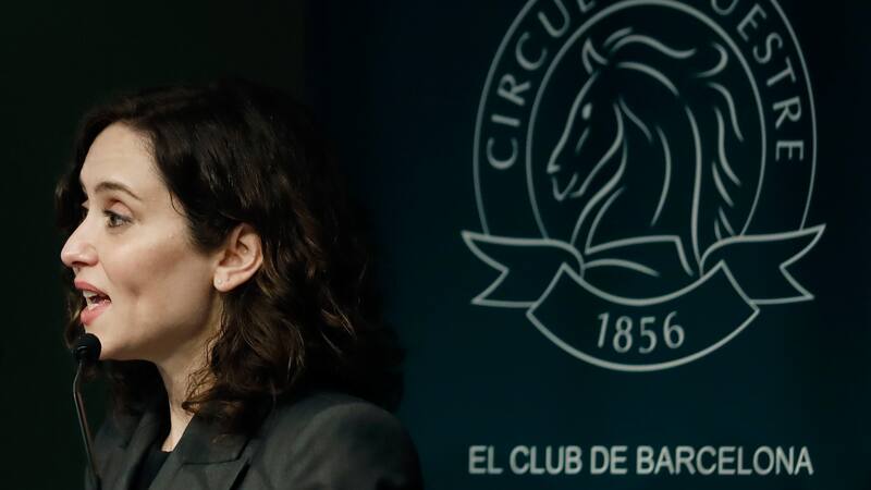 Ayuso ha protagonizado una conferencia en el Círculo Ecuestre de Barcelona, con presentación del vicepresidente de esa institución, Enrique Lacalle, y el dramaturgo Albert Boadella.