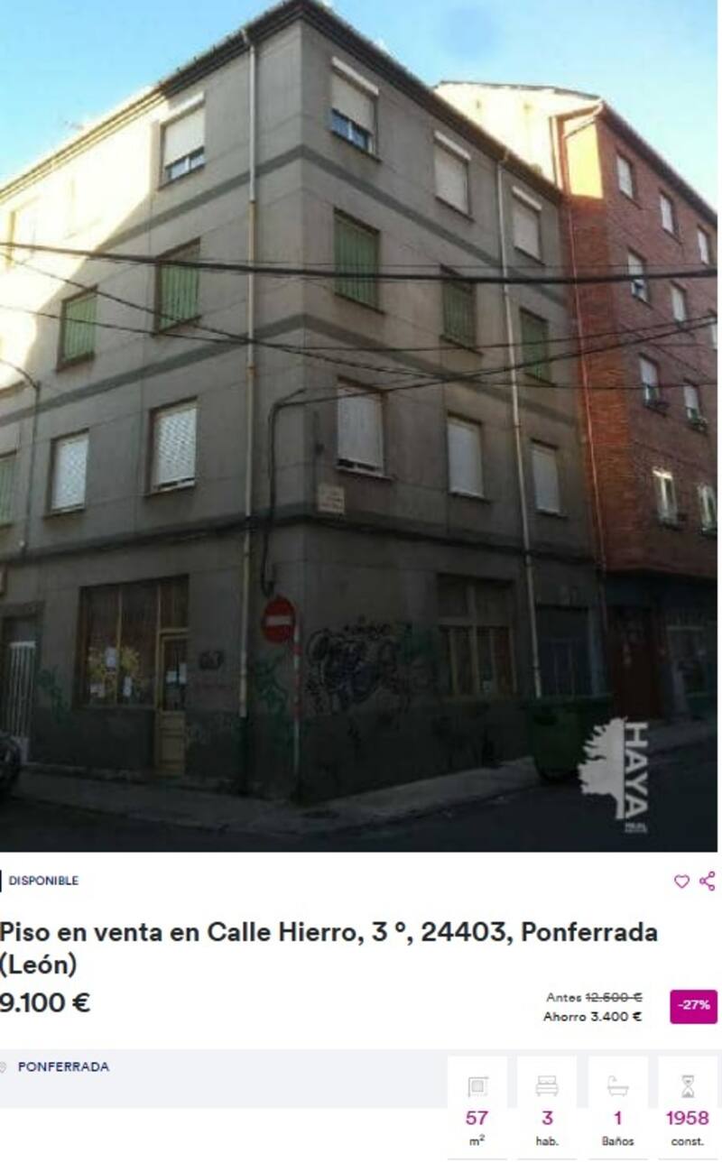 Situada en Ponferrada, León, se encuentra este piso con tres dormitorios y un baño a reformar en la planta tercera de un edificio sin ascensor. El lugar tiene 57 metros cuadrados y tiene un valor de mercado de 9.100 euros.