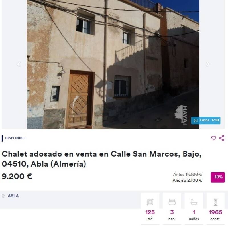 Una casa unifamiliar adosada para reformar en la ciudad de Abla, Almería. Construido en 1965, cuenta con dos plantas sin ascensor, tres dormitorios, un baño, un salón-comedor y cocina. Tiene un valor de 9.200 euros.