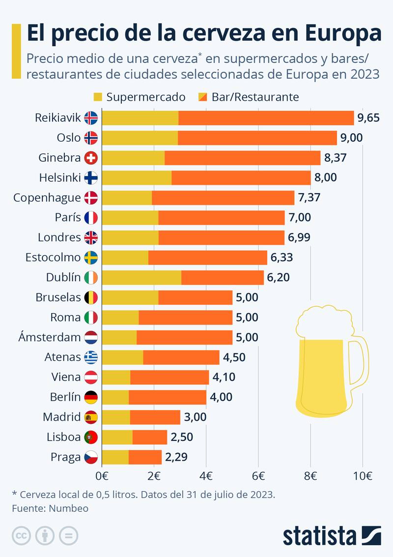 En ciudades como Lisboa (Portugal) y Madrid (España), el precio medio de una cerveza de 0,5 litros en un restaurante oscila entre los 2,5 y 3 euros, llegando incluso a reducirse a unos 2,29 euros en Praga (República Checa). En estos territorios, el coste medio en el supermercado es aproximadamente un euro por cada medio litro.
