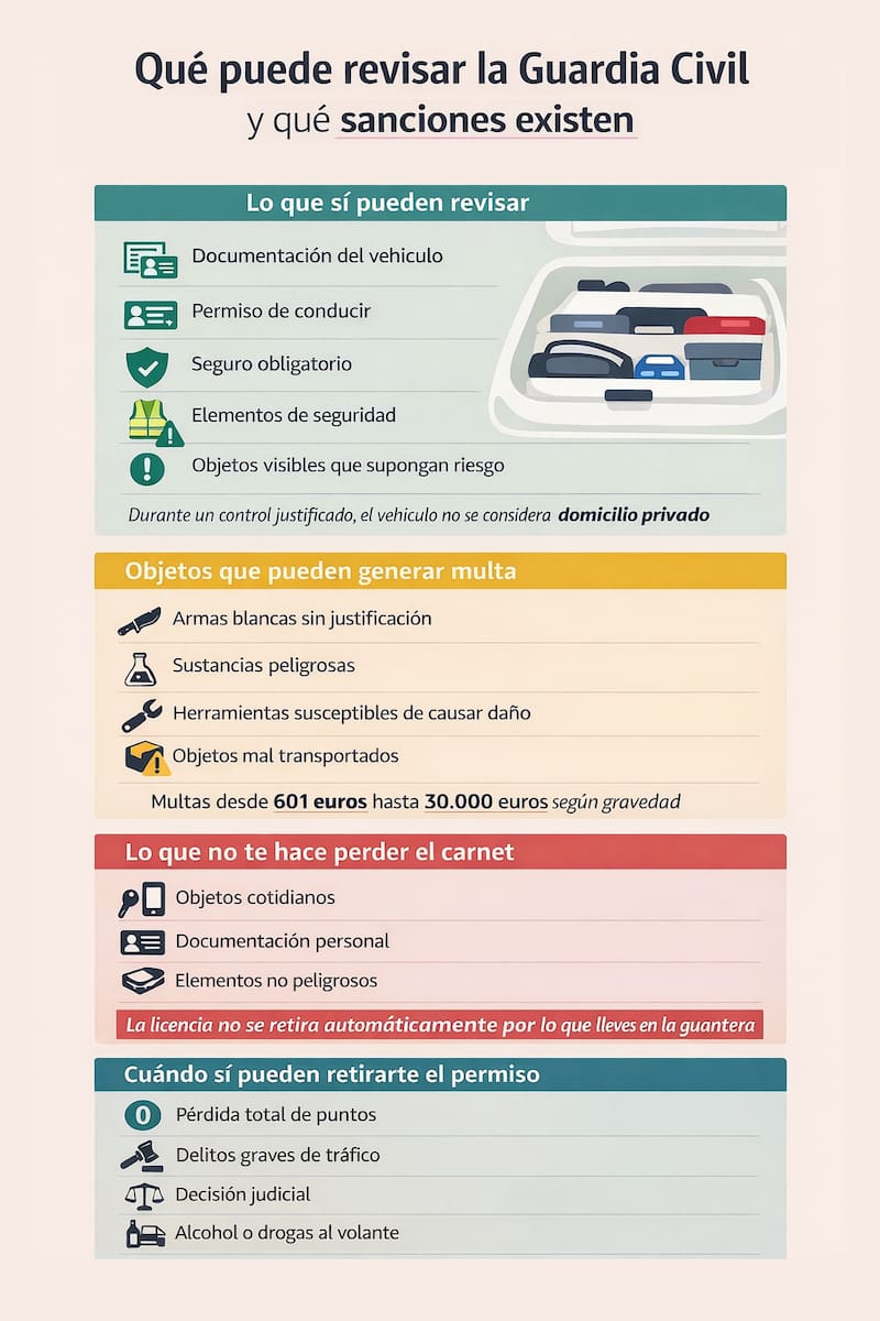 La Guardia Civil puede abrir la guantera y comprobar su contenido, pero solo impondrá sanciones económicas o administrativas si lo que se encuentra está prohibido por la ley o incumple normas de seguridad vial o de orden público. Estas sanciones pueden incluir multas, retirada de los objetos confiscados o apercibimientos según la gravedad del caso, pero no la retirada automática del carnet.