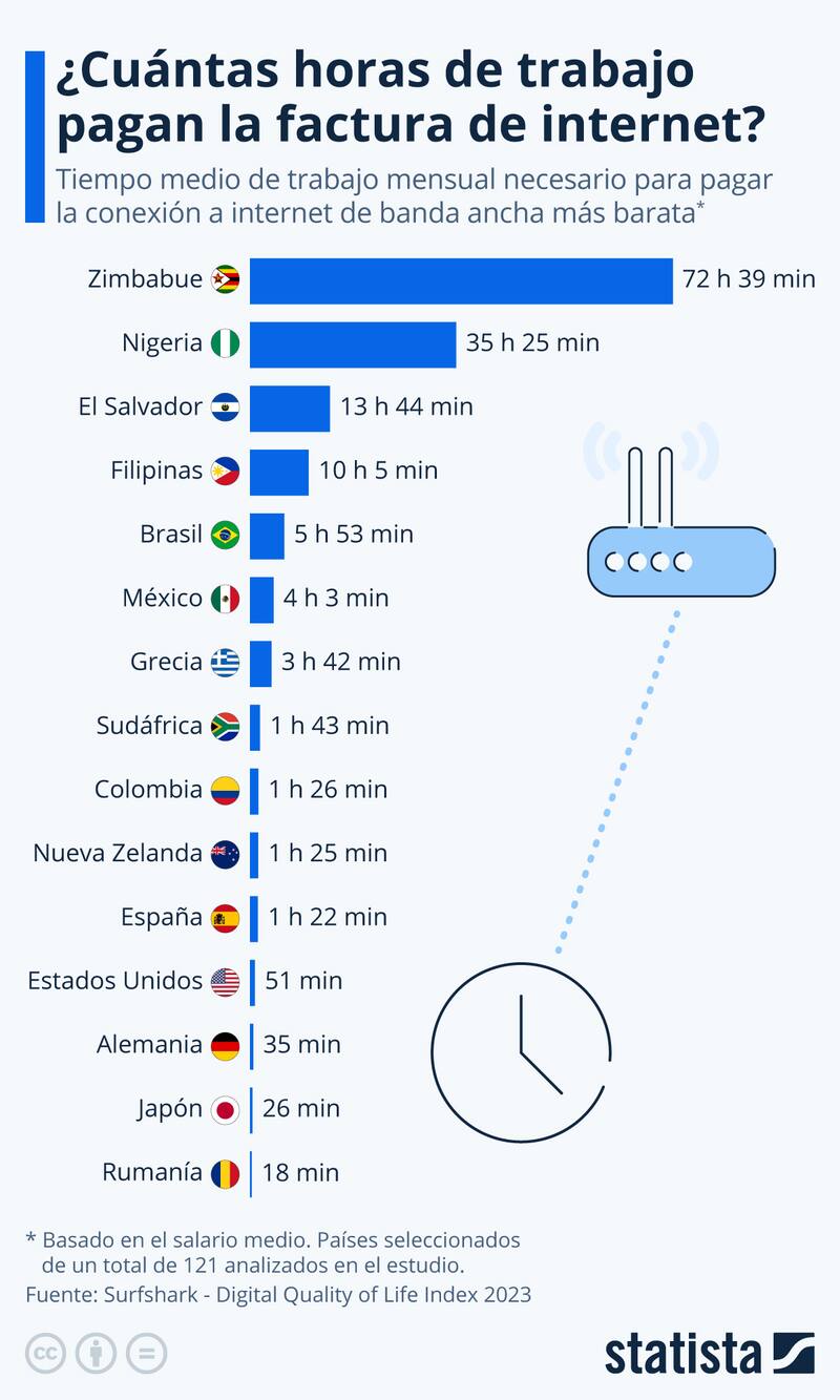 A continuación, la infografía publicada en el sitio web de Statista que muestra el tiempo medio de trabajo mensual necesario para pagar laconexión a internet de banda ancha más barata en una selección de países.