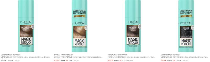 Una de estas opciones es el retoca raíces instantáneo L'Oréal Magic Retouch. Este producto actúa como un eficaz cubriente para las áreas desprovistas de pigmentación en las raíces, siendo apto tanto para cabello natural como teñido. Sus precios rondan los 8 euros aunque pueden estar en rebajas y conseguirse más económicos.