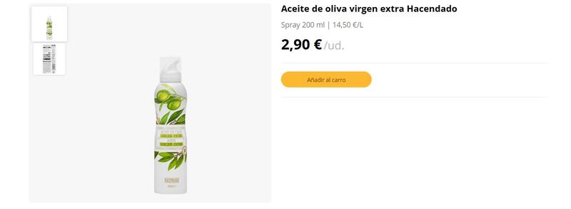 En la sección alimentos de la cadena valenciana se encuentra el aceite de oliva virgen extra de Hacendado, presentado en un bote de 200 mililitros y en formato spray a un precio de 2,90 euros.