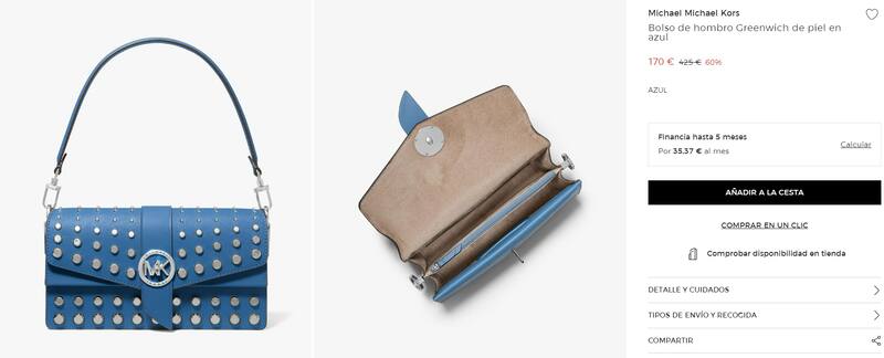 Pero eso no es todo, ya que también hay otras opciones que cuentan con importantes descuentos. Por ejemplo, un bolso de hombro Michael Kors Greenwich de piel en azul se puede encontrar por 170 euros, lo que sería un 40% menos de su valor anterior que era de 425 euros.