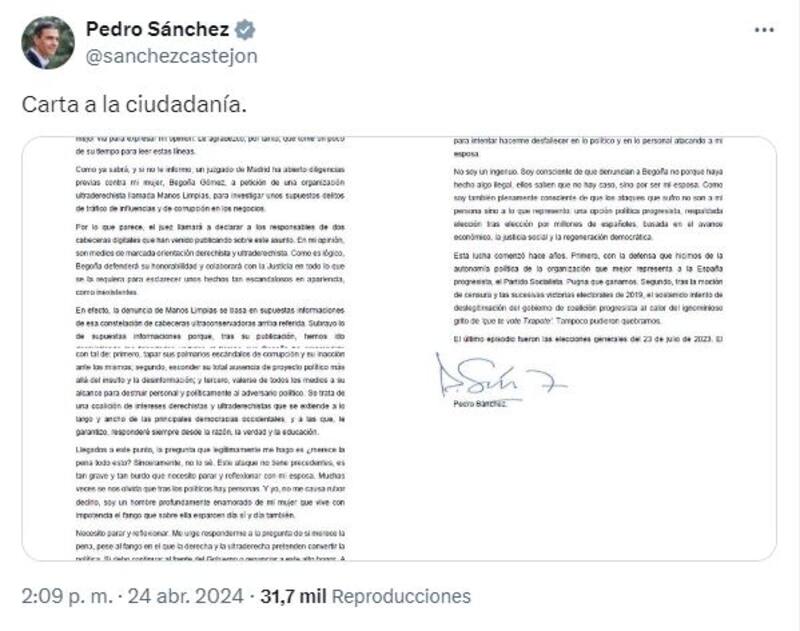 Más tarde, el titular del Ejecutivo publicó una carta dirigiéndose directamente a los españoles. Defendió a su pareja y aseguró que "analizará" su continuidad en el Gobierno.