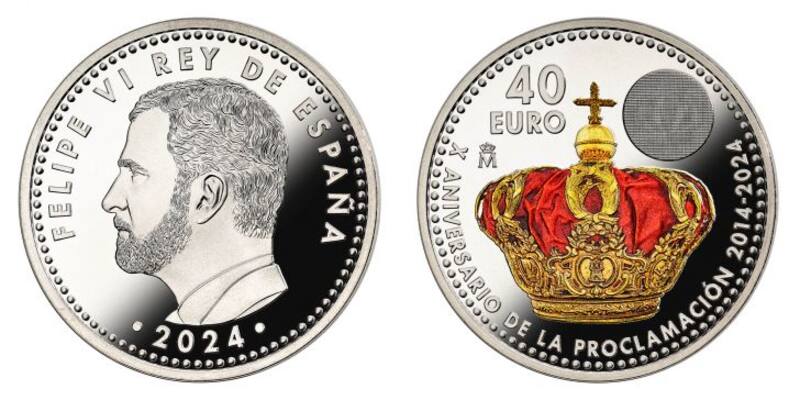Desde el 17 de junio del 2024, se encuentra disponible la moneda conmemorativa de 40 euros que celebra el décimo aniversario de la proclamación del rey Felipe VI. Esta pieza, elaborada en plata, es una edición limitada, con una circulación restringida a un millón de unidades.
