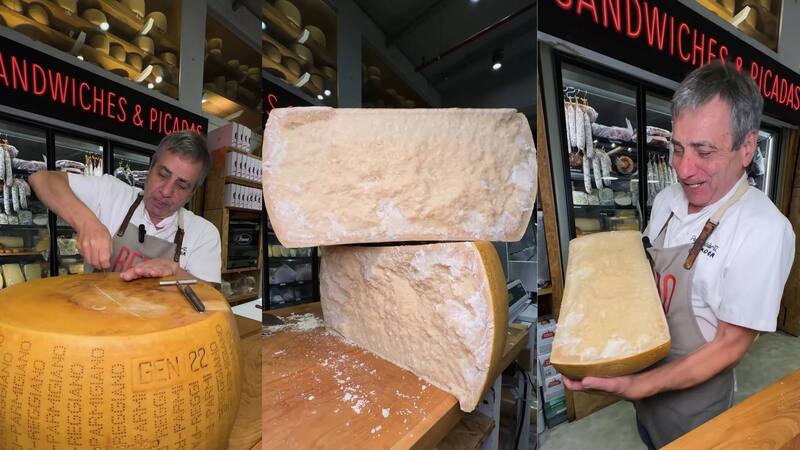 El clip mostrando el queso en una mesa de madera, una rueda curada durante años y varios cuchillos que rompe la corteza con un crujido nítido. El quesero acerca la cara y respira hondo. Luego suelta una exclamación de felicidad y se besa los dedos. La emoción lo atraviesa y se vuelve contagiosa.