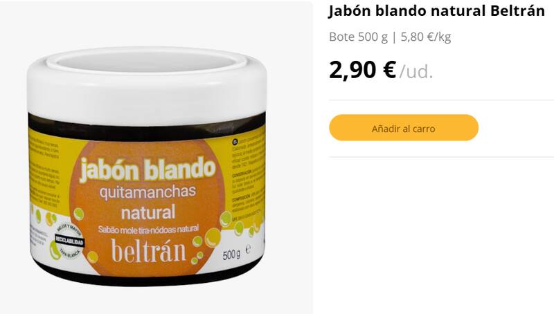Este jabón, formulado a partir de aceites vegetales y completamente libre de aceite de palma, es 100% biodegradable y eliminará eficazmente cualquier rastro de maquillaje, vino o aceite de sus textiles. Nos referimos al jabón quitamanchas Beltrán, un producto potásico, natural y de notable durabilidad.