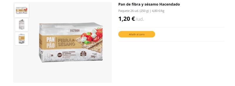 La opción en cuestión es el pan de fibra y sésamo de la marca Hacendado, cuyo paquete de 26 unidades y un peso total de 250 gramos se ofrece en los locales de la firma y en su tienda web por tan solo 1,20 euros.