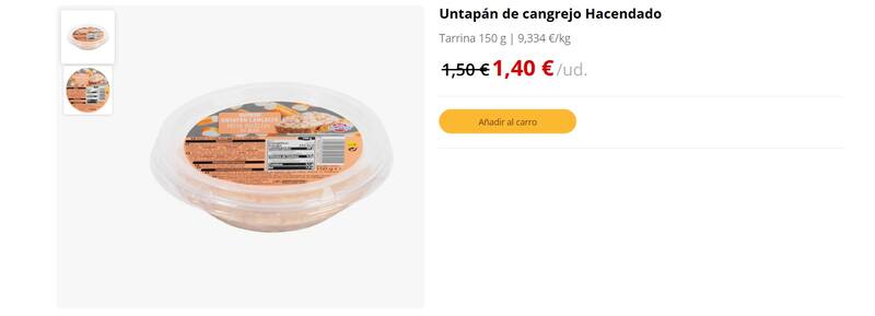 La referencia es para el untapán de cangrejo de la marca Hacendado, un artículo que crece en popularidad entre los clientes de la cadena valenciana por sus atributos nutritivos y por su agradable textura y sabor.