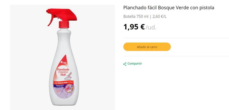 El producto al que se hace referencia en esta ocasión es el llamado Planchado Fácil de la marca Bosque Verde, el cual viene en una práctica y cómoda botella de 750 mililitros con pistola y cuesta tan solo 1,95 euros.