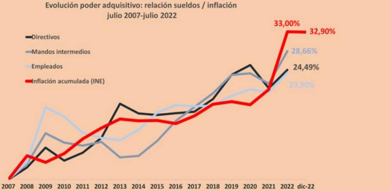 Además, la consultora ICSA ha realizado su propio informe, el cual concluye que la inflación acumulada entre 2007 y 2022 fue del 33%, mientras que el crecimiento de los salarios fue del 23,9% en el mismo período. Por lo tanto, los sueldos de los empleados cayeron un 9,1%.