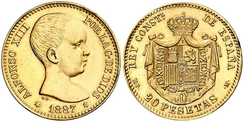 La moneda de 20 Pesetas de 1887 fue reacuñada en 1961 y 1962 utilizando los cuños originales de la época. Se optó por modificar los ensayadores para distinguirlas de la moneda original.